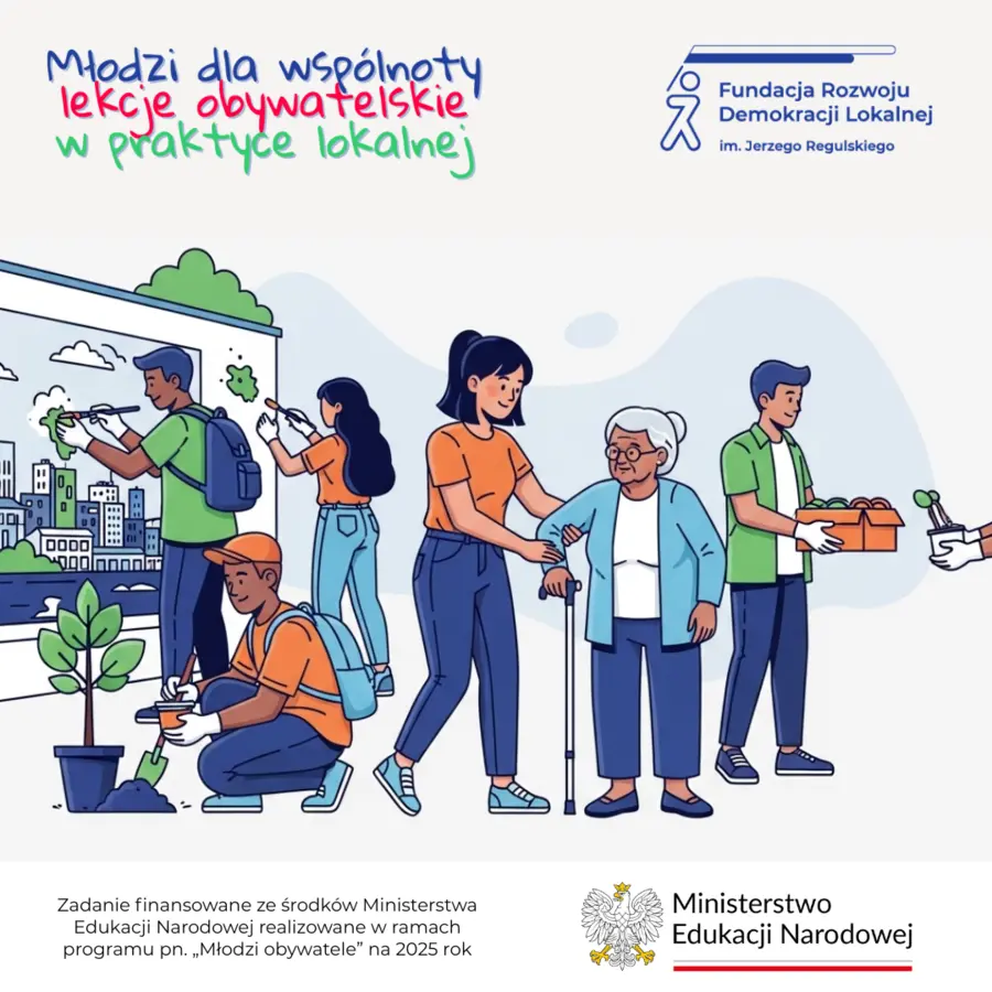 Zapraszamy szkoły ponadpodstawowe z Mazowsza do udziału w projekcie "Młodzi dla wspólnoty – lekcje obywatelskie w praktyce lokalnej", realizowanym w ramach programu Ministra Edukacji "Młodzi Obywatele 2025". Zgłoszenia przyjmujemy do 2 października 2025 r.