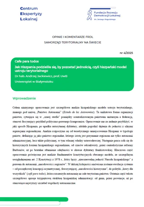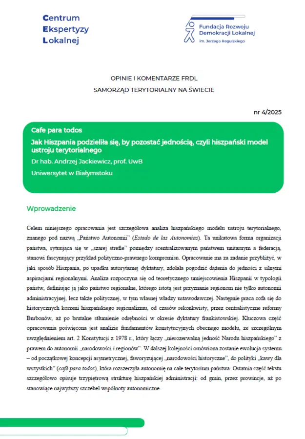 Przedmiotem opracowania jest hiszpański model ustroju terytorialnego, znany jako „Państwo Autonomii” (Estado de las Autonomías). Opracowanie sytuuje ten model jako formę pośrednią między scentralizowanym państwem unitarnym a federacją, podkreślając jego doktrynalny, a nie czysto prawny charakter. Celem tekstu jest analiza jego złożonej genezy, ewolucji oraz fundamentalnych zasad prawnych i strukturalnych. Najważniejsze ustalenia wskazują, że u jego podstaw leży świadome napięcie wpisane w Konstytucję z 1978 r., która łączy zasadę „nierozerwalnej jedności Narodu hiszpańskiego” z gwarancją „prawa do autonomii stanowiących go narodowości i